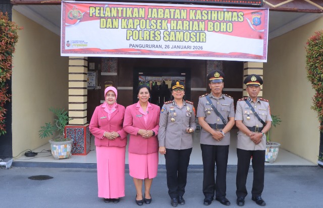 SAMOSIR (Sumut) ketikberita.com | Kapolres Samosir AKBP Rina Sry Nirwana Tarigan, S.I.K secara resmi melantik Kasi Humas dan Kapolsek Harian Boho Polres Samosir dalam upacara pelantikan jabatan yang digelar di halaman apel Mako Polres Samosir, Senin (26/1/2026) sore.