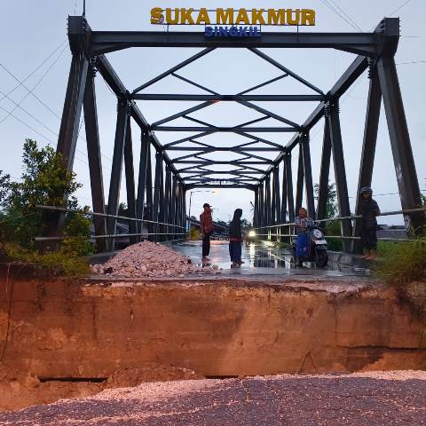ACEH SINGKIL (Aceh) ketikberita.com | Banjir yang melanda wilayah Kecamatan Singkil pada Rabu (26/11/2025) menyebabkan jembatan utama Desa Suka Makmur ambruk dan memutus total akses transportasi masyarakat. Intensitas hujan yang tinggi sejak malam sebelumnya membuat debit air sungai meningkat tajam hingga menggerus struktur jembatan.