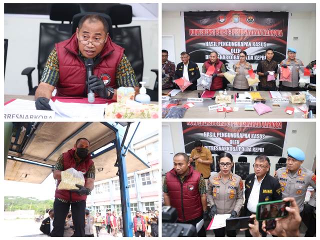 “Dari puluhan kasus tersebut, kepolisian berhasil menyita barang bukti keseluruhan yaitu Sabu (1.732,25 Gram), Ekstasi (18.403 Butir), Etomidate (2.568 Pcs), dan Happy Water (162,36 Gram)”, jelas Kabidhumas Polda Kepri Kombes Pol. Dr. Nona Pricillia Ohei, S.I.K., S.H., M.H.