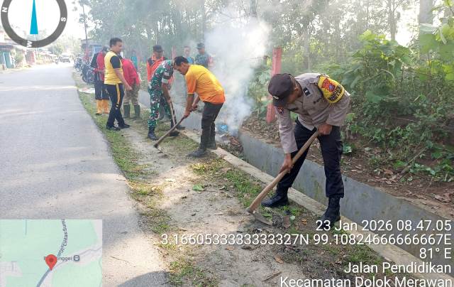 TEBING TINGGI (Sumut) ketikberita.com | Kapolsek Dolok Merawan Iptu Zuhri Zulkarnain Lubis diwakili Kanit Samapta Ipda Fery Siagian memimpin kegiatan gotong royong (Gotroy) Jumat Bersih bersama Bhabinkamtibmas yang dilaksanakan di Gapura Desa Dolok Merawan hingga ke Balai Umum Dusun II Desa Dolok Merawan Kecamatan Dolok Merawan Kabupaten Serdang Bedagai, Jumat (23/1/2026).