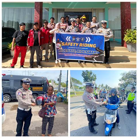 Selain itu, personel turut membagikan helm standar SNI dan brosur keselamatan kepada masyarakat sebagai bentuk edukasi preventif mengenai pentingnya keselamatan dalam berkendara.