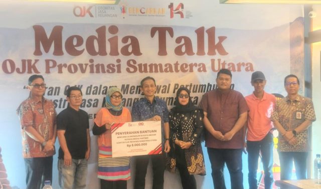 Usai sesi materi dan tanya jawab, OJK Sumut menyerahkan bantuan secara simbolis kepada lima perwakilan wartawan. Penyerahan dipimpin langsung oleh Khoirul Muttaqien, didampingi Direktur Pengawasan Perilaku PUJK, Edukasi, Pelindungan Konsumen, dan Layanan Manajemen Strategis OJK Sumut, Yusri, serta Direktur Manajemen Strategis, Edukasi dan Perlindungan Konsumen, dan Kemitraan Pemerintah Daerah OJK Sumut, Wan Nuzul Fachri.