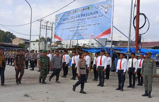 Kapolres Samosir AKBP Rina Sry Nirwana Tarigan membacakan amanat Kapolri menyampaikan bahwa Apel Gelar Pasukan Operasi Ketupat 2026 dilaksanakan secara serentak di seluruh Indonesia sebagai bentuk pengecekan kesiapan personel serta sarana dan prasarana pengamanan.