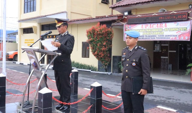 Melalui amanatnya, Inspektur Upacara Kompol Eduard, S.H. menyampaikan pesan penuh makna tentang semangat perjuangan dan pengorbanan para pahlawan bangsa, Senin (10/11/2025).