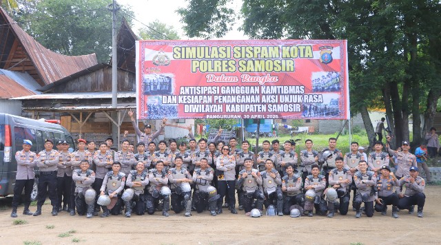 Kegiatan dilaksanakan Kamis (30/4/2026) sekitar di Pangururan, Samosir. Simulasi ini dipimpin langsung oleh Kapolres Samosir, AKBP Rina Sry Nirwana Tarigan, S.I.K, M.H.