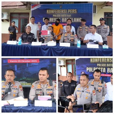 BATAM (Kep.Riau) Ketikberita.com | Polsek Batu Aji berhasil mengungkap dengan cepat kasus dugaan tindak pidana pembunuhan dan/atau penganiayaan yang menyebabkan kematian yang terjadi di wilayah Tanjung Uncang, Kecamatan Batu Aji, Kota Batam. Konferensi pers pengungkapan kasus ini dipimpin langsung oleh Kapolresta Barelang Kombes Pol Zaenal Arifin, S.I.K., didampingi Kapolsek Batu Aji AKP Raden Bimo Dwi Lambang, S.Tr.K., S.I.K., M.H., Kasihumas Polresta Barelang Iptu Budi Santosa, S.H., serta Kanit Reskrim Polsek Batu Aji Iptu Andy Pakpahan, S.H., yang berlangsung di Mapolsek Batu Aji, pada Kamis (9/10/2025).
